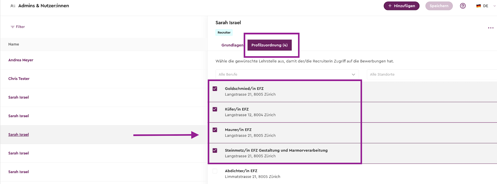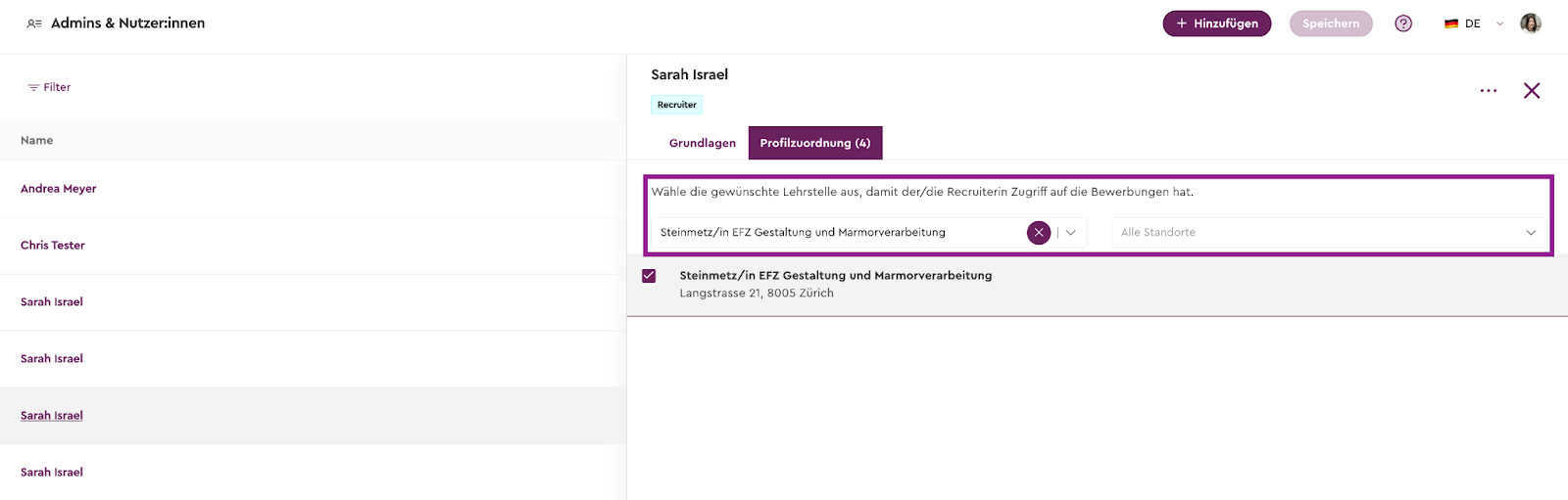 Sobald Du im Tab „Admins & Nutzer:innen“ einen Recruiter anklickst und “Profilzuordnung” wählst, werden alle diesem Recruiter zugeordneten Lehrstellen automatisch ganz oben in der Liste angezeigt.