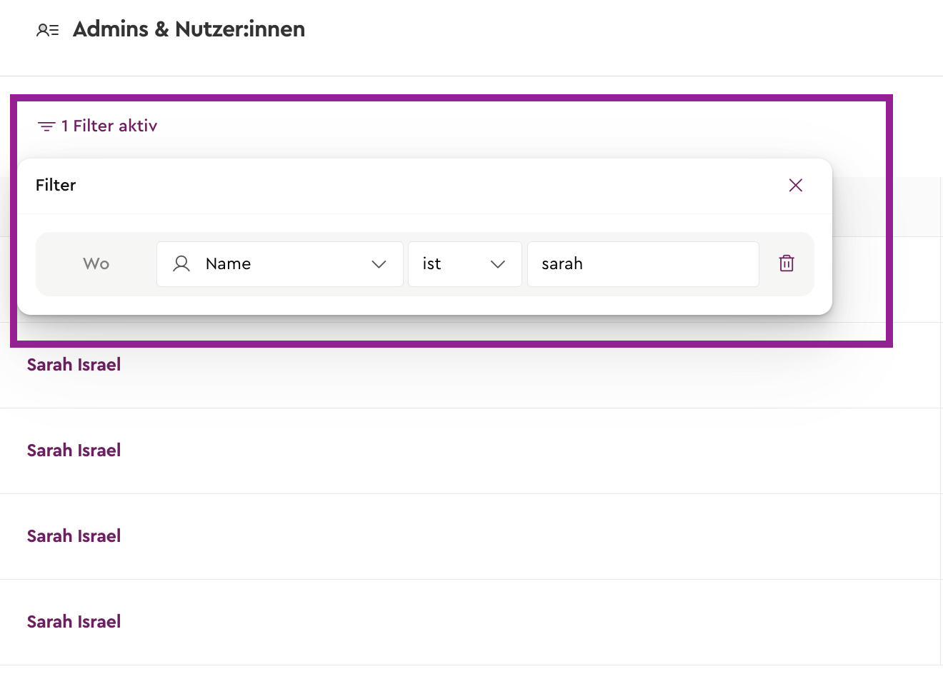 Im Bereich „Admins & Nutzer:innen“ steht Dir ein Namensfilter zur Verfügung.